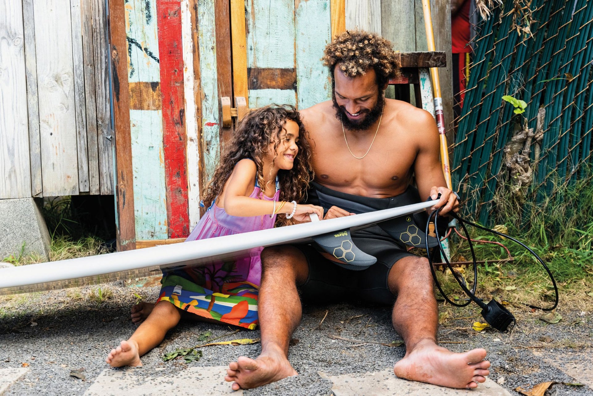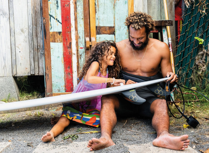 Eala and daughter, Marzi waxing boards for winter. Photo Chachi