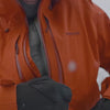 Two offset chest pockets with watertight zippers of different sizes offer storage for large, bulky gloves on the left and smaller items on the right; jacket quickly self-stuffs into the left-chest pocket with a carabiner clip loop